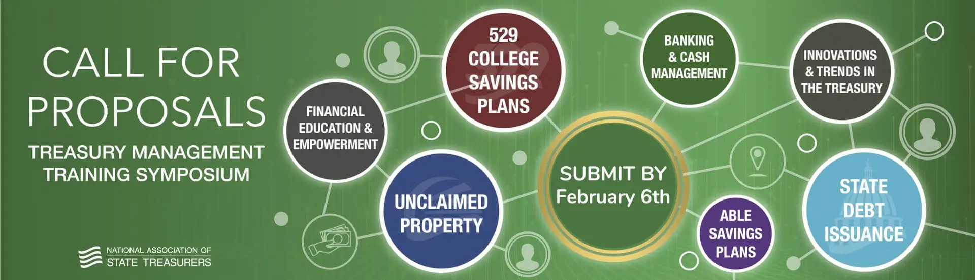 Corporate Affiliate members are invited to submit proposals that highlight relationships with NAST public finance members. Likewise, State Treasurers and agency staff are encouraged to submit proposals showcasing where they excel. Sessions with diverse multi-person panelists (from public and private sectors) will be given preferential rating.